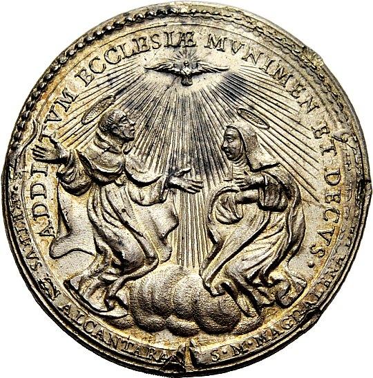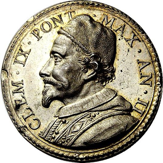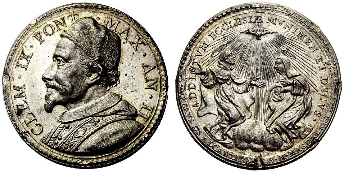Medaglie e placchette. Clemente IX, 1667-1669. Medaglia anno II (1669). per la canonizzazione di Pietro d’Alcantara e Maddalena de’ Pazzi (opus: Gaspare Morone), argento coniato 24,62g. Ø 34 mm. CLEM IX PONT MAX AN II Busto a s., con camauro mozzetta e stola decorata con losanga. Rv. ADDITVM ECCLESIÆ MVNIMEN ET DECVS I due nuovi Santi irradiati dallo Spirito Santo; sotto, nel giro, S PETRVS DE ALCANTARA S M MAGDALENA DE PAZZIS. Miselli 700. Rarissima. Coniazione originale. Tracce di graffettatura, altrimenti q.Fdc Contrariamente a quanto sostenuto dal Miselli, questo non è un “ riconio anacronistico “ ma la medaglia originale, in quanto la canonizzazione del 28 aprile 1669 cadeva proprio nel secondo anno di pontificato che terminava il 19 giugno 1669. Tuttalpiù l’annuale del III anno sembrerebbe ottenuta da questa aggiungendo il terzo numerale seminascosto dal busto.