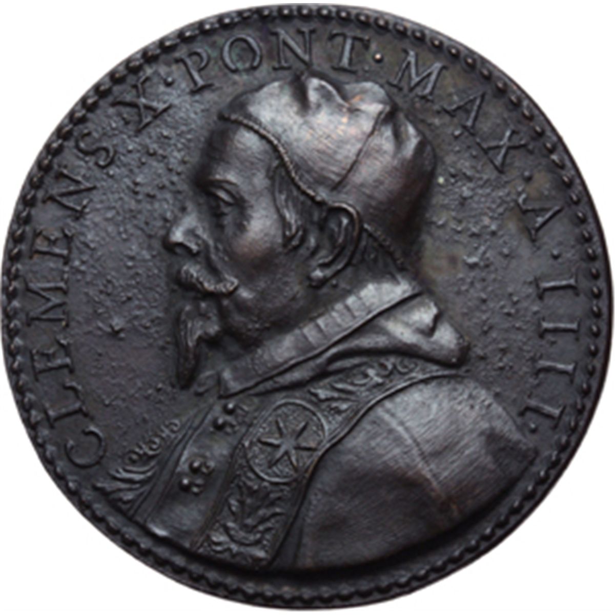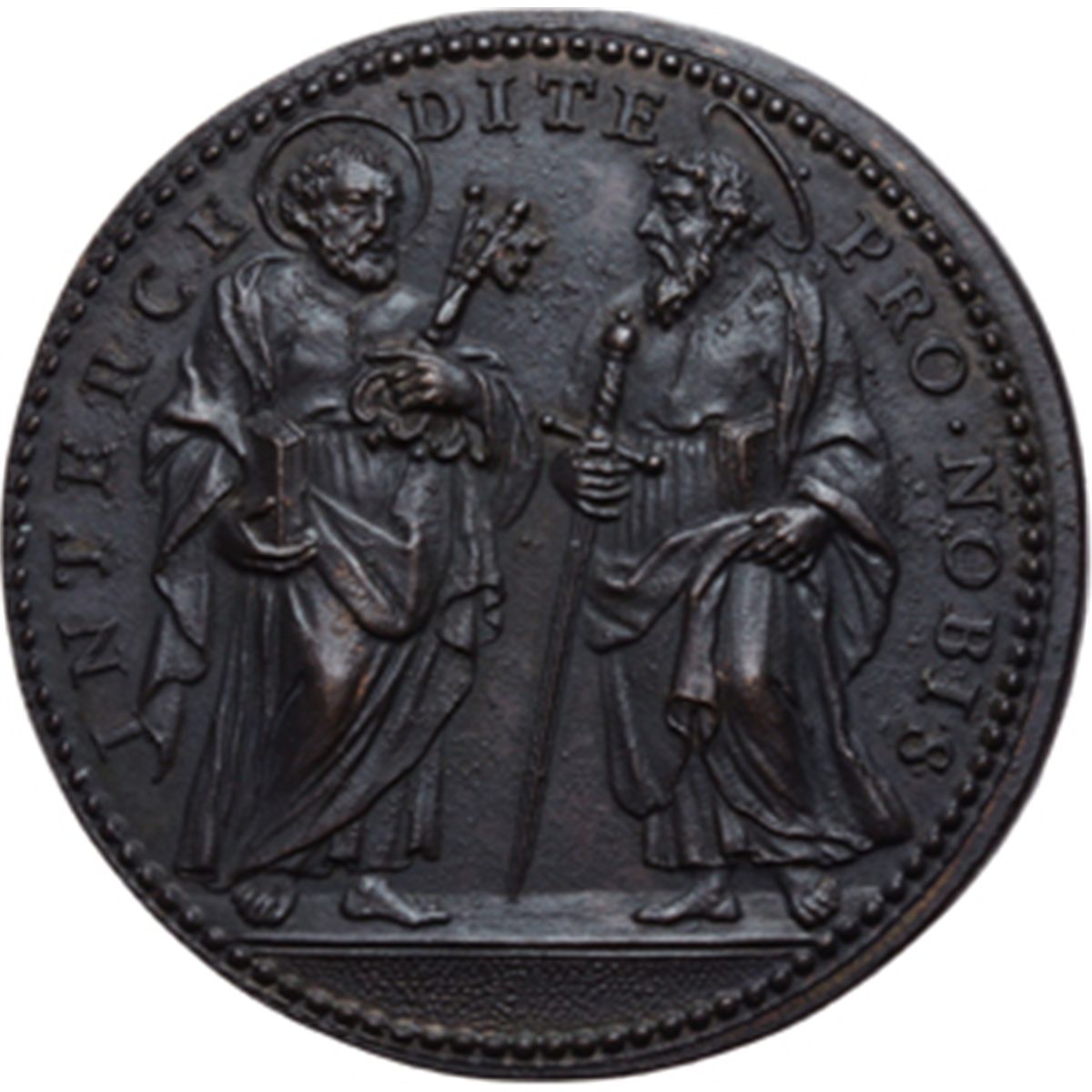 Medaglie Papali. Clemente X (1670-1676), Emilio Bonaventura Altieri. Medaglia annuale, A. IV. Riconio. D/ Busto a sinistra con camauro, mozzetta e stola. R/ I SS. Apostoli Pietro e Paolo. Bart.E. 673a. Spink 1321. AE. mm. 35.80 Inc. Gerolamo Lucenti. Incrostazioni. qFDC.