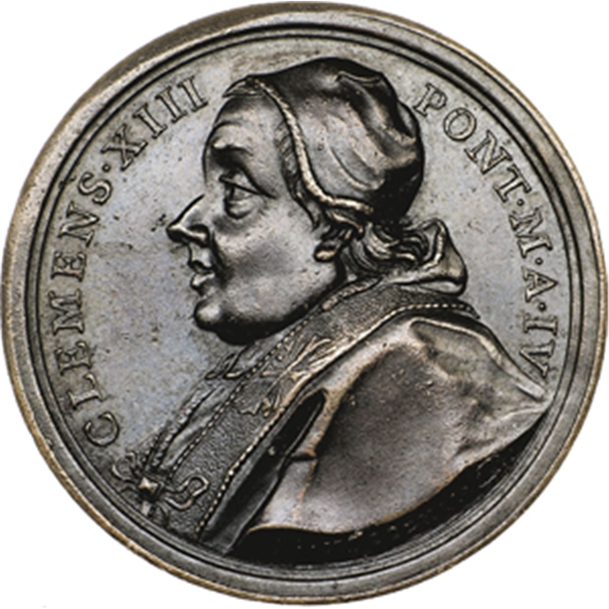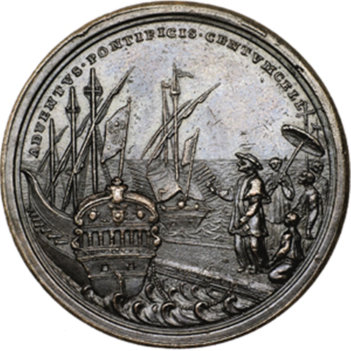 Medaglie Papali. Clemente XIII (1758-1769), Carlo Rezzonico. Medaglia annuale A.IV. D/ Busto a sinistra con camauro, mozzetta e stola. R/ Il Papa benedice un vascello nel porto di Civitavecchia. Bart.E. 762. AE. mm. 36.00 Inc. Ottone Hamerani. R. qFDC. Per la visita del Pontefice a Civitavecchia in occasione del varo di due nuovi vascelli il S. Carlo ed il S. Clemente.