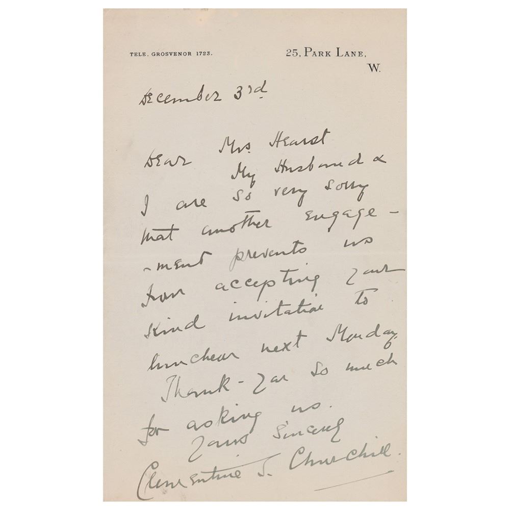 ALS signed “Clementine S. Churchill,” one page, 5 x 8, 25 Park Lane letterhead, December 3 [1929]. Handwritten letter to Millicent Hearst, the wife of media tycoon William Randolph Hearst, in full: "My husband and I are so very sorry that another engagement presents us from accepting your kind invitation to luncheon next Monday. Thank-you so much for asking us." In fine condition. Accompanied by two postal telegraphs from Churchill to Hearst, dated October 18 and 26, 1929, both of which regard tea or dinner get-togethers.