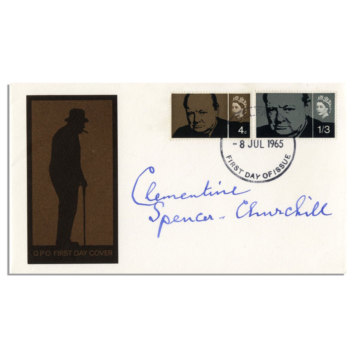 Clementine Spencer-Churchill signs a 1965 first day cover issued by the British General Post Office commemorating her husband, Sir Winston Churchill, who died earlier that year. The 6.5'' x 3.75'' cover, dated 8 July 1965, is postmarked from Belfast. The Baroness, who was a member of the House of Lords on this date, signs ''Clementine Spencer-Churchill''. Fine condition.