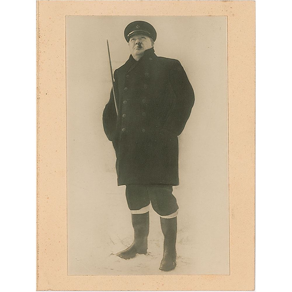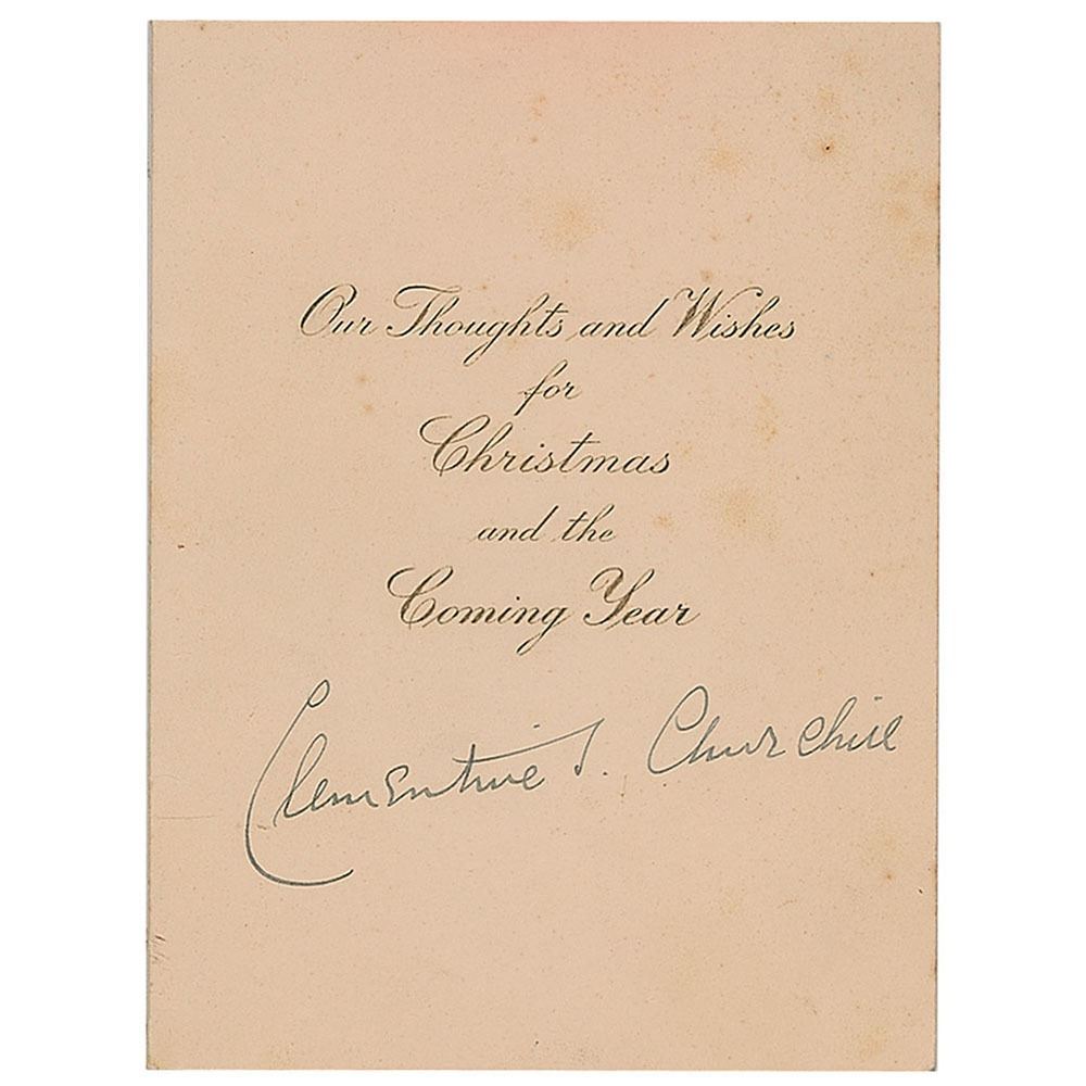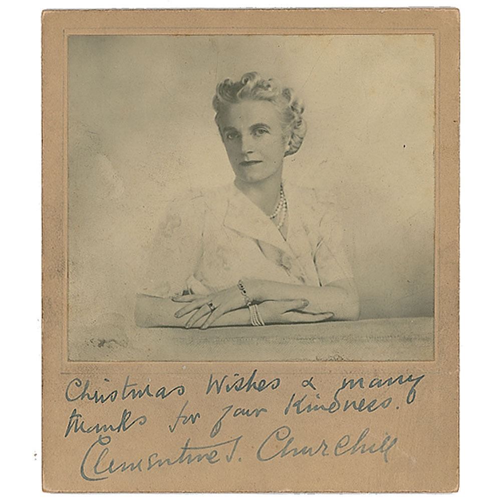 Two items: a vintage matte-finish photo of Clementine Churchill, affixed to the original 4 x 4.75 studio mount, signed on the mount in fountain pen, "Christmas wishes & many thanks for your kindness, Clementine S. Churchill"; and a vintage Christmas card with printed text on front, 4.5 x 6.25, signed on the front in fountain pen, "Clementine S. Churchill," with interior featuring a splendid full-length photo of Winston Churchill with warm coat, cigar, and cane. In overall very good to fine condition, with soiling to the photo, and scattered light foxing to the card.