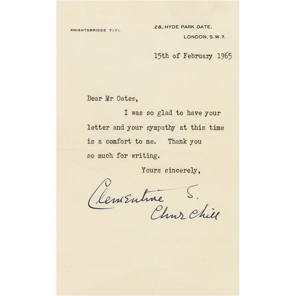 TLS signed “Clementine S. Churchill,” one page, 5 x 8, 28 Hyde Park Gate letterhead, February 15, 1965. Letter to Mr. Oates, in full: “ I was so glad to have your letter and your sympathy at this time is a comfort to me. Thank you so much for writing.” In fine condition, with some light creasing in the blank areas. Sir Winston Churchill suffered a fatal stroke on January 12, 1965, and died 12 days later on the 24th.