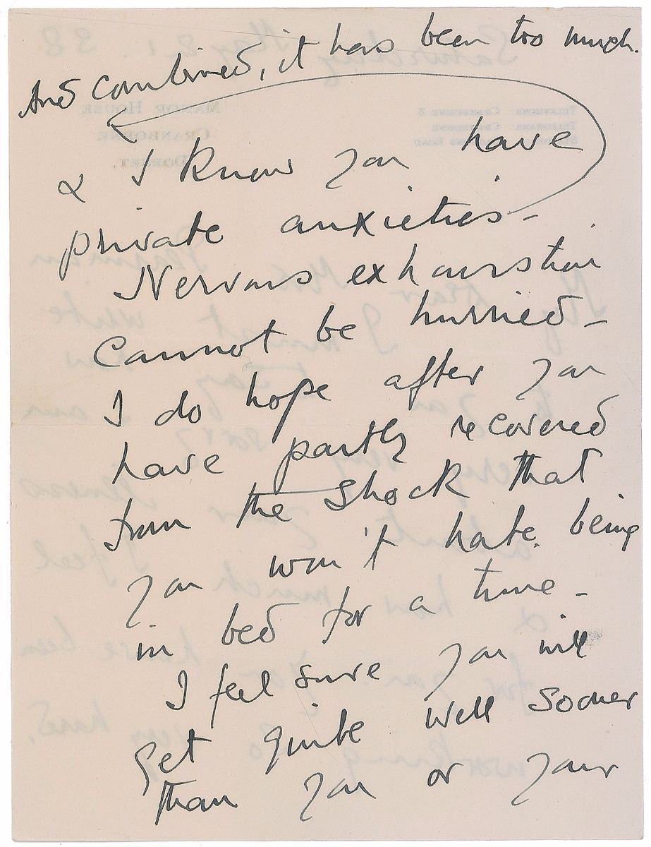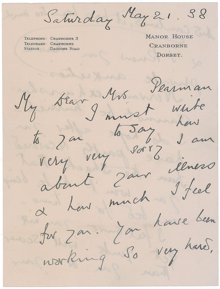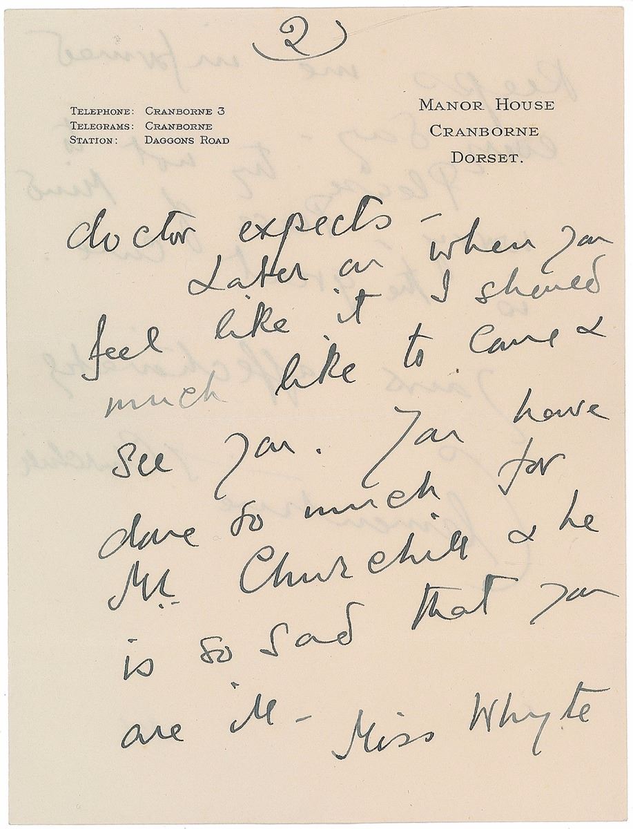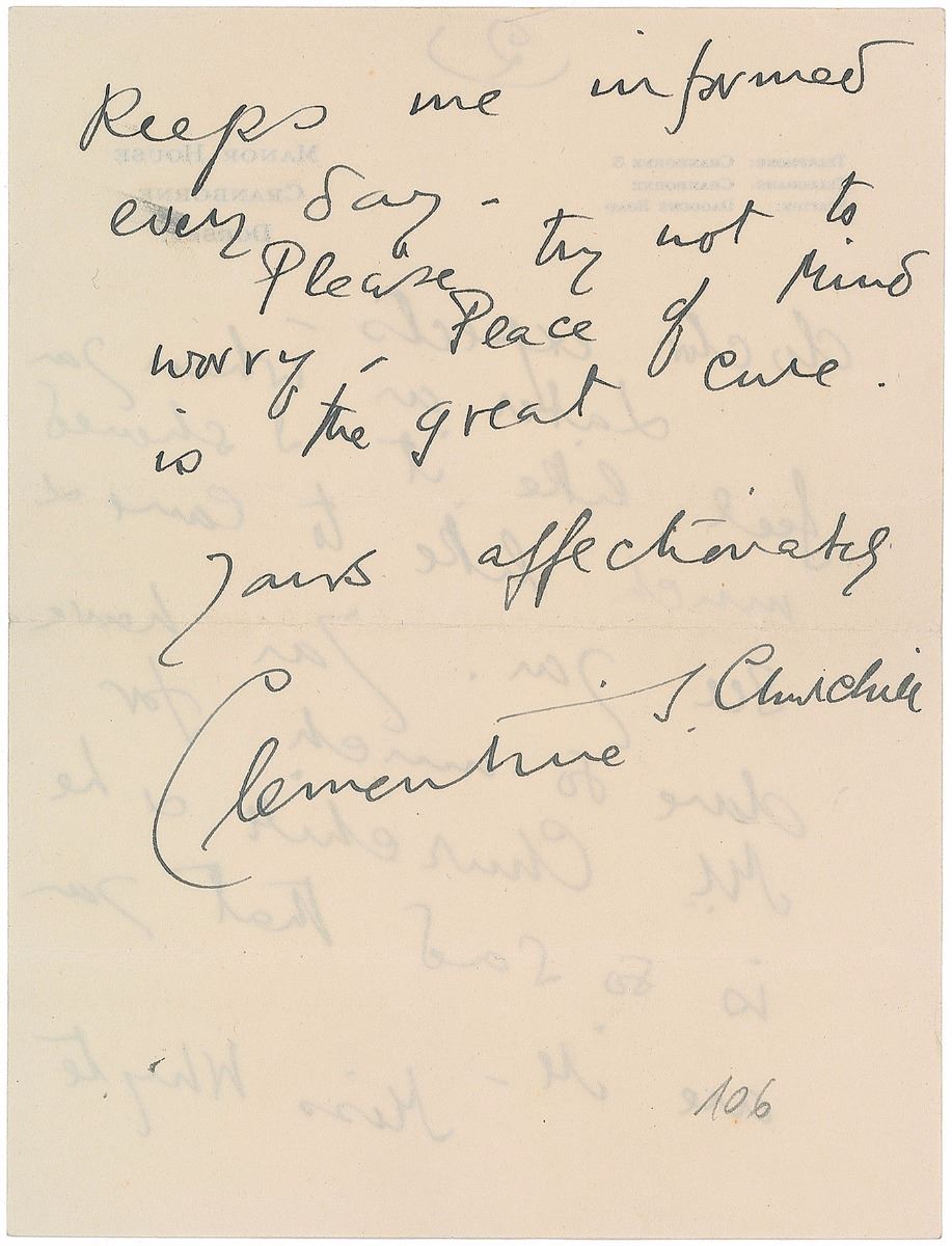 ALS signed “Clementine S. Churchill,” four pages on two sheets, 5.25 x 7, Manor House letterhead, May 21, 1938. Letter to Mrs. Pearman, in full: “I must write to you to say how very very sorry I am about your illness & how much I feel for you. You have been working so very hard & I know you have private anxieties. And combined, it has been too much. Nervous exhaustion cannot be hurried. I do hope after you have partly recovered from the shock that you won’t hate being in bed for a time. I feel sure you will get quite well sooner than you or your doctor expects. Later on when you feel like it I should much like to come & see you. You have done so much for Mr. Churchill & he is so sad that you are ill. Miss Whyte keeps me informed every day. Please try not to worry. Peace of mind is the great cure.” In fine condition, with slight creasing to top edge of first page, and several horizontal folds.