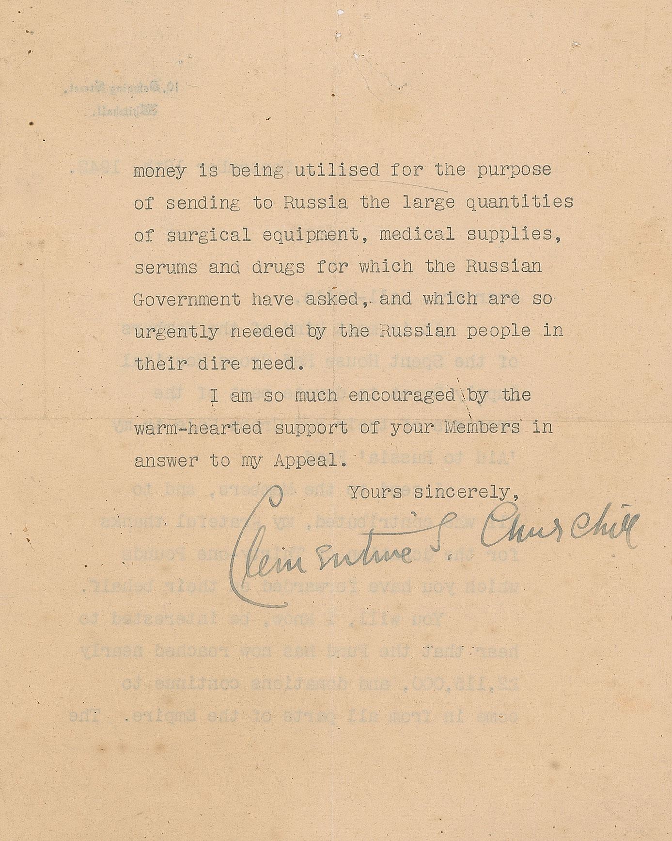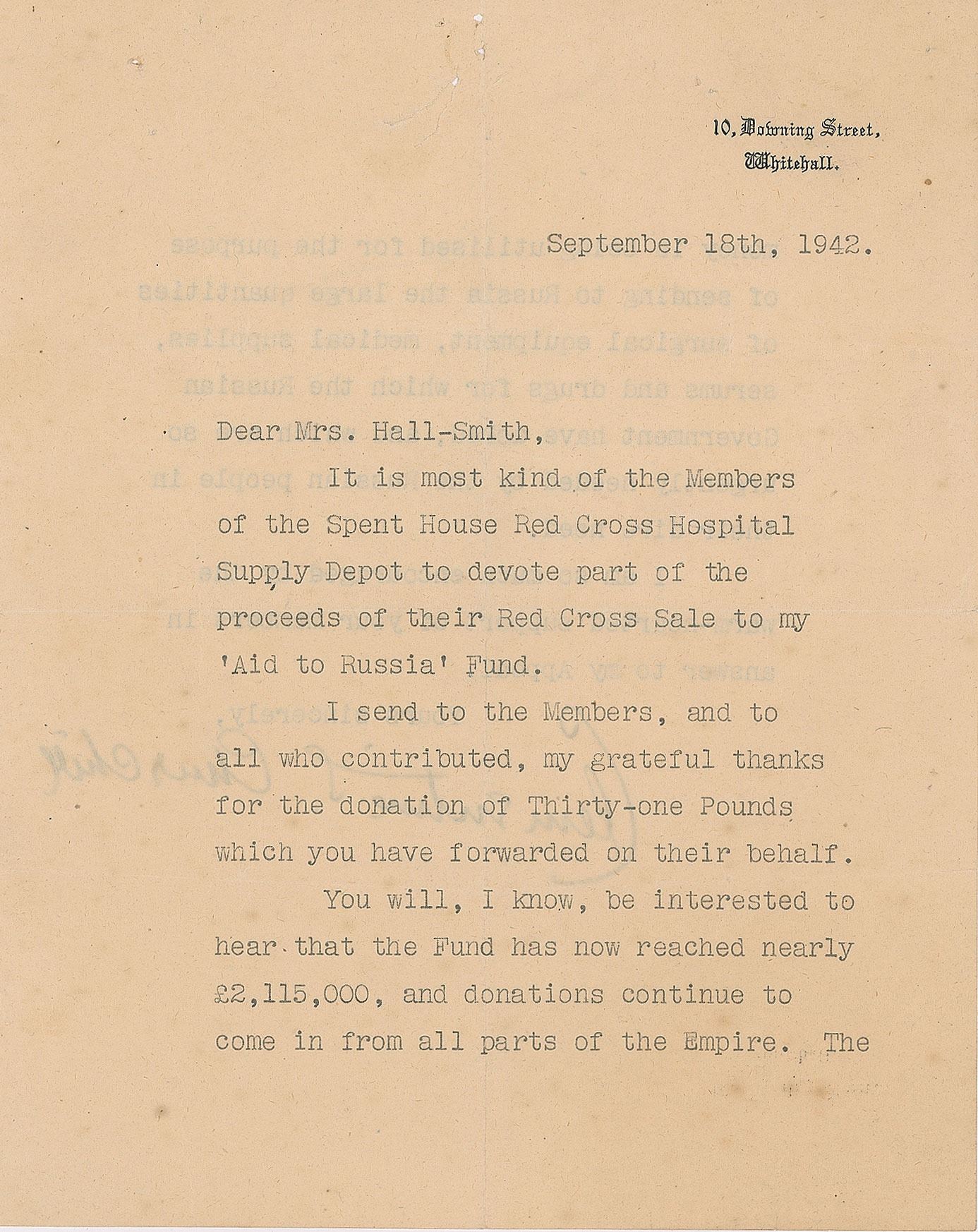 TLS signed “Clementine S. Churchill,” one page both sides, 7 x 8.75, 10 Downing Street letterhead, September 18, 1942. Poignant letter to "Mrs. Hall-Smith," in part: "It is most kind of the Members of the Spent House Red Cross Hospital Supply Depot to devote part of the proceeds of their Red Cross Sale to my 'Aid to Russia' Fund. I send to the Members, and to all who contributed, my grateful thanks for the donation of Thirty-one Pounds which you have forwarded on their behalf. You will, I know, be interested to hear that the Fund has now reached nearly £2,115,000, and donations continue to come in from all parts of the Empire. The money is being utilized for the purpose of sending to Russia the large quantities of surgical equipment, medical supplies, serums and drugs for which the Russian Government have asked, and which are so urgently needed by the Russian people in their dire need." In very good to fine condition, with a tear and some tack holes to the upper blank area.