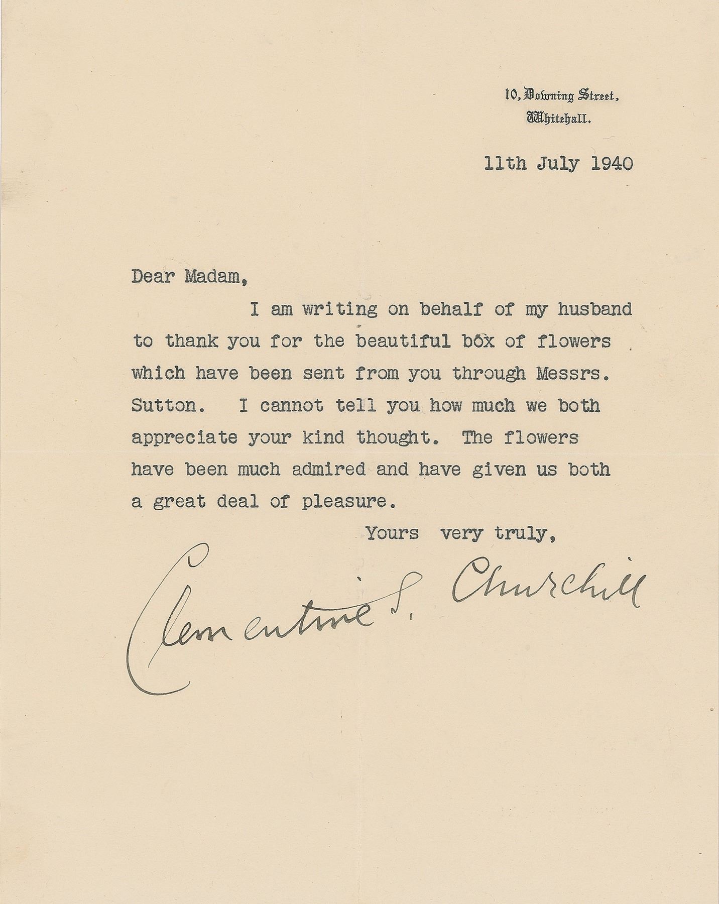 TLS signed “Clementine S. Churchill,” one page, 7.5 x 9.5, 10 Downing Street letterhead, July 11, 1940. In full: "I am writing on behalf of my husband to thank you for the beautiful box of flowers which have been sent from you through Messrs. Sutton. I cannot tell you how much we both appreciate your kind thought. The flowers have been much admired and have given us both a great deal of pleasure." In fine condition.