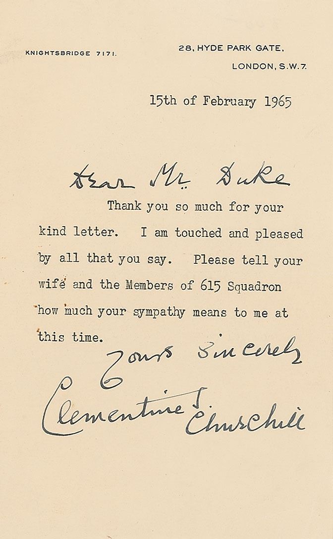 TLS signed “Yours sincerely, Clementine S. Churchill,” one page, 5 x 8, 28 Hyde Park gate letterhead, February 15, 1965. Letter to Mr. Duke, in full: "Thank you so much for your kind letter. I am touched and pleased by all that you say. Please tell your wife and the Members of 615 Squadron how much your sympathy means to me at this time." Churchill adds the salutation in her own hand. In fine condition. Her husband of 56 years, Sir Winston Churchill, passed away 22 days prior.