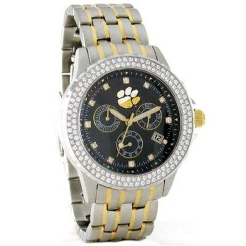 <P><STRONG>Clemson Tigers Game Time Legend Diamond Bezel Mens NCAA Watch<BR><BR>The FABULOUS Legend Diamond Bezel Chronograph Sport Watch<BR><BR>Features<BR>* Ronda Swiss 5040D Quartz Analog chronograph movement<BR>* Scratch resistant sapphire crystal <BR>* Solid stainless steel case<BR>* Solid stainless steel bracelet in single link construction with fine brushed finish and 23K gold accents <BR>* Double push button buckle with safety clasp, etched with team logo<BR>* Ceramic dial with luminous hands and team logo<BR>* 12 Genuine VVS-G diamond indices featuring larger diamonds at 12, 3, 6, 9<BR>* Diamond bezel with over 2 carats total weight VVS-G diamonds.<BR>* Elapsed and split time Chronograph, 1/10 second counter at 6 OÆclock, chronograph second hand in center, minute counter at 9:30 OÆclock <BR>* Second hand dial at 2:30, date at 4 oÆclock <BR>* Screw in gold crown and gold chronograph push buttons<BR>* Stainless steel screw down case back<BR>* Water resistant to 100 meters/330 ft. <BR>* Alternate black and brown genuine leather straps with stainless steel spring bars <BR>* Packaged in metal brief case with 23k gold plate etched with team logo<BR>* 5 Year Limited Warranty</STRONG><BR><BR><STRONG>*SPECIALLY hand crafted.<BR>*DELIVERY Time - 6 to 8 weeks from receipt of order! </STRONG></P><P></P>