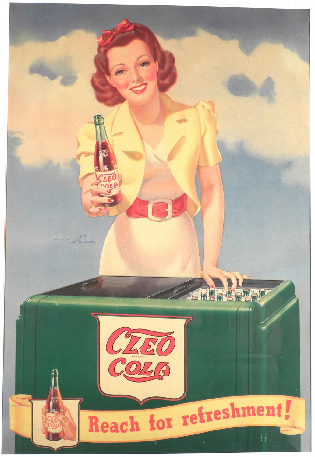 Cleo Cola Cardboard Sign. Maid by "illiom". Framed under glass. Nail hole at top right otherwise excellent condition. 22 X 32 inches image only.