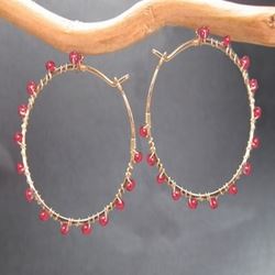 Metal: GoldHammered hoops with garnet, about 1-1/4" diameter Available in either 14K gold-filled, rose gold-filled, or sterling silver. All jewelry is entirely handmade in our studio in New York.