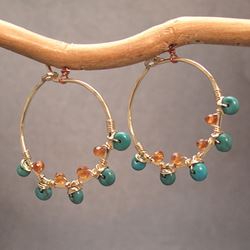 Metal: SilverTurquoise and madarin garnet wrapped around small hammered hoops, about 1" diameter. Available in either 14K gold-filled, rose gold-filled, or sterling silver. All jewelry is entirely handmade in our studio in New York.