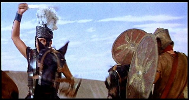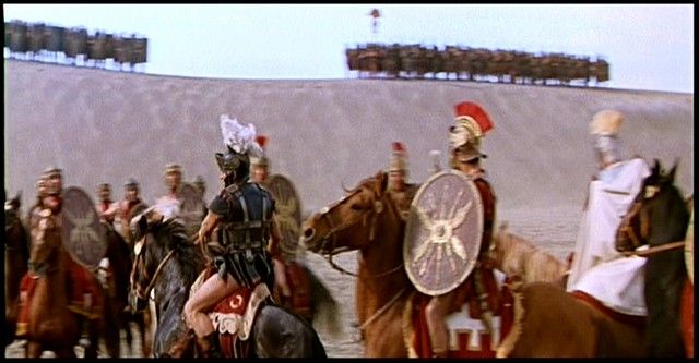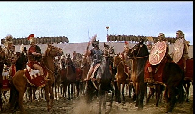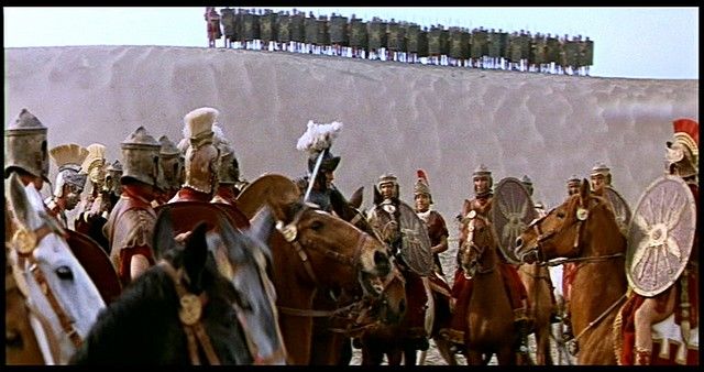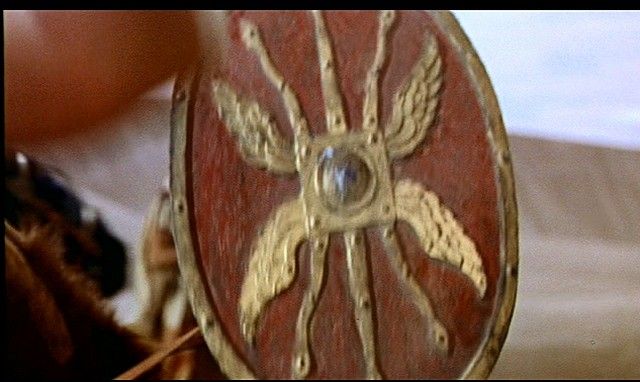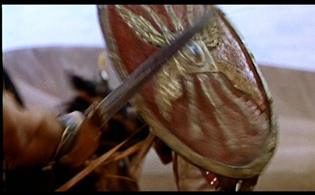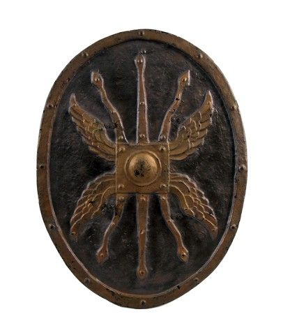 Cleopatra (1963) Octavian Army Horse Solider Shield Prop - "Cleopatra" (1963) is one of the most controversial and magnificently epic films ever produced. Perhaps known more for the romantic dalliances of Elizabeth Taylor and Richard Burton, than the staggering budget (which virtually bankrupted 20th Century Fox Studios), and Brobdignagian (as the press called it) colossal runaway production, it still boggles the mind with its eye-popping scale in cast, sets, costumes and action. Long before CGI, and with only minimal use of matte paintings and miniatures, this was the real thing. And one of the last movies to use real fall scale sets, extras, etc. Actually after several decades, this monumental motion picture actually made its money back and now enjoys a profit with every DVD, Blue-Ray and re-release. This is a screen used Horse-Soldier's Shield of Octavian's Army. These shields are seen to great effect in one of the most emotionally charged scenes when after strong pressure from Cleopatra (Elizabeth Taylor), Mark Antony (Richard Burton) finds himself literally alone on the morning of his battle against Caesar Augustus Octavian's (Roddy McDowall) advancing Army. After his loyal friend and confident Rufio (Martin Landau) kills himself, Antony, literally all alone, rides out to face battle. And with staggering courage, he goes against a massive line of Octavian's Horse Soldiers, using his sword against their shields. He tries to goat Octavian into a one-on-one combat, but in the end, facing his most humiliating moment in a stellar career, gives up, turns and flees back into the city. This hero production used shield is in excellent condition, showing some signs of battle. It is made of reinforced fiberglass, specially art-directed and painted to look like brass and wood. The original bolted loop-handles are still in the back. Approx 29"x22".