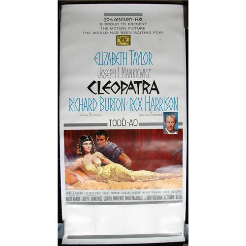 <Our item number 130022><B>Cleopatra (1963) - Original Three Sheet Poster.</B> 81 x 41 in. linen-backed color lithograph poster for 20th Century Fox's 1963 historical epic that starred Elizabeth Taylor and Richard Burton. The film is considered the second most expensive ever produced, costing over $44 million at the time--comparable to over $300 million today! Small pinholes in linen backing do not affect poster which is in excellent condition with normal folds and outstanding artwork. <BR>Estimated Value $400 - 600. <BR><BR>Our item number 130022<BR><IMAGES><P ALIGN="CENTER"><IMG SRC="http://www.goldbergcoins.net/liveauction/49jpegs/130022.jpg"> </P></IMAGES>