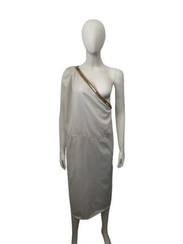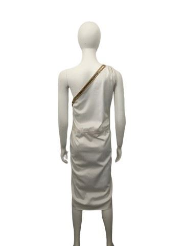 Custom-made Cleopatra style white dress with gold sequins trim. Was made for one of the oldest and largest costume stores in Los Angeles that has been in business for over 75 years. Dress has some stain by the armpit in the back of the dress and some stains on the bottom. Since it's custom made there is no exact size but will fit a small to medium female.
