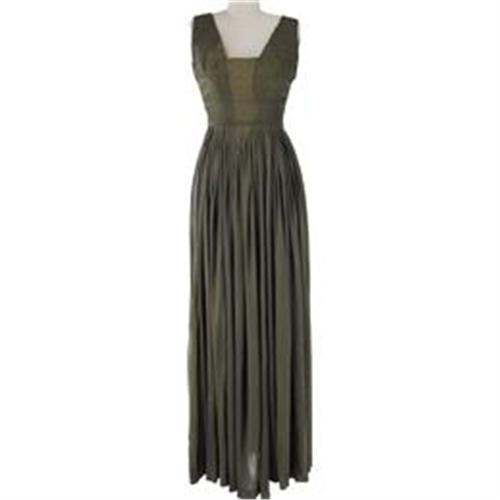 <B>"Cleopatra" One-Piece Gown.</B></I> Full-length, olive-colored satin gown designed for Elizabeth Taylor to be worn in the film, with her name written on the inside label. In excellent condition.
