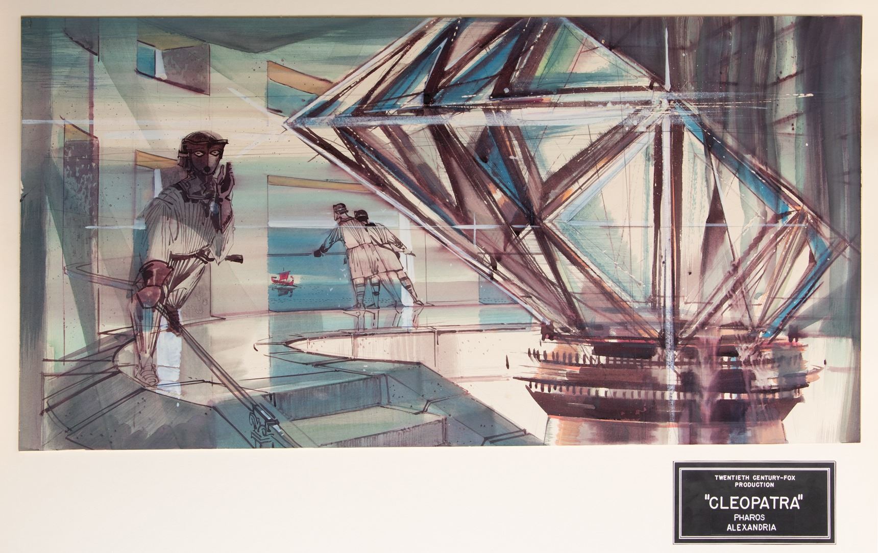 263. Cleopatra "Pharos Alexandria" set design painting by John DeCuir. (TCF, 1963) Vintage original concept sketch accomplished in gouache on 36.5 x 18.25 in. artists leaf tipped to 30 x 40 in. backing board. With 7 x 3.25 in. title card affixed to the lower right and retaining the original SPB sticker from the 1971 20th Century Fox Studio auction. Exhibiting production wear, age and minor warping to backing board. In vintage very good condition. Provenance: 20th Century Fox "Fox II" public auction. Lot 609. Nov. 15-21, 1971. This lot is from the estate of Dwight Richard Odle (1941-2018). Proceeds will go to the St. Jude Memorial Foundation. $300 - $500