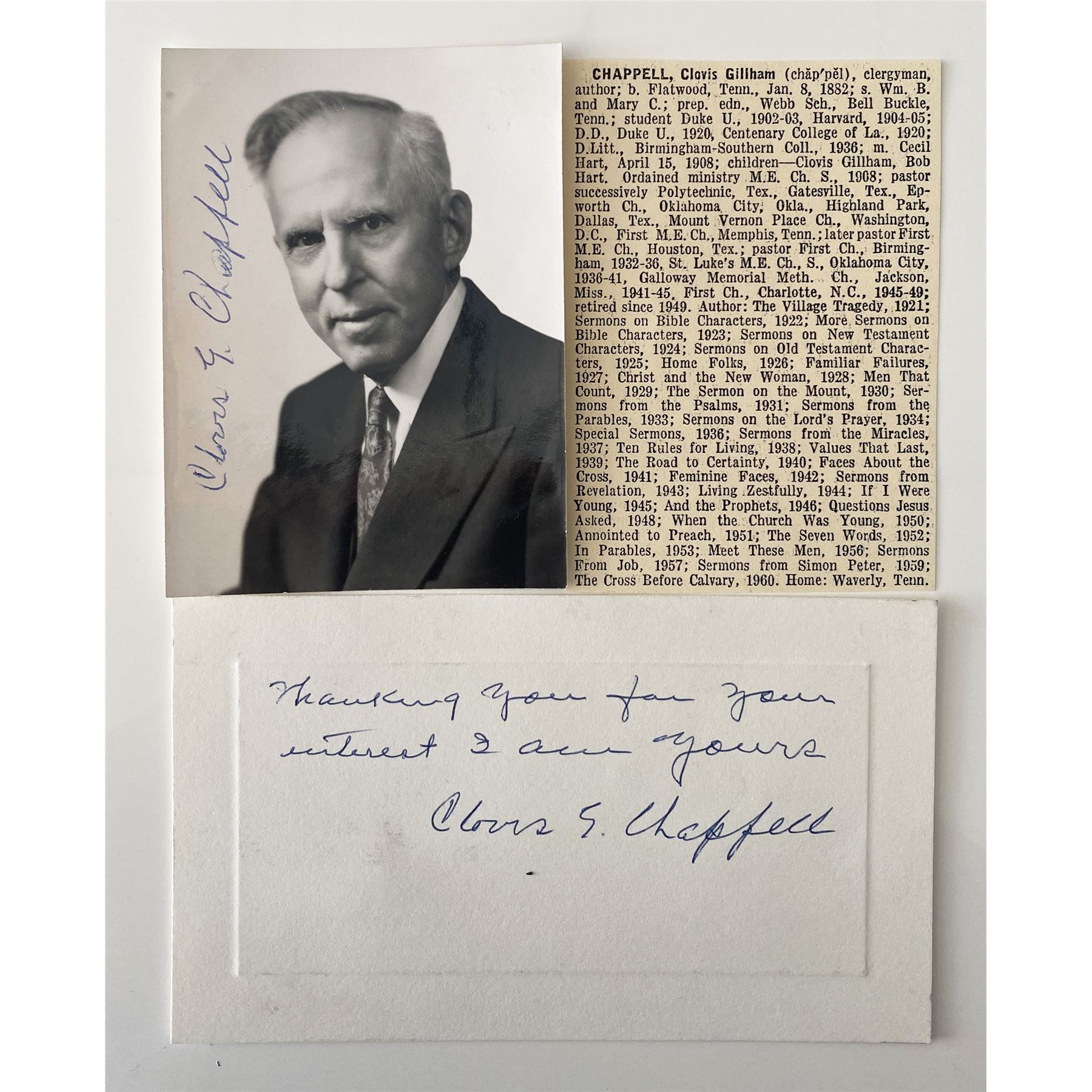 Clergyman and author Clovis G. Chappell signed photo and note.6x4 inches