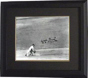 In his 16-year career, Clete Boyer hit 162 home runs with 654 runs batted in and a .242 batting average in 1725 games played. The 1961 team (with Mickey Mantle, Roger Maris, Yogi Berra and Moose Skowron), which defeated the Cincinnati Reds in the World Series, was considered by many as the best eve. Boyer batted only .224 during the regular season, but more than made up for it with his defense in an infield that also featured the double play duo of Tony Kubek at shortstop and Bobby Richardson at second base. In the first game of that World Series, Boyer displayed his defense by making two spectacular plays—one on a ground ball in the second inning, in which Boyer stopped the ball backhanded and threw Freese out from his knees, and another on a Dick Gernert ground ball in which Boyer dove to his left and threw Gernert out, also from his knees. Clete Boyer has hand signed this New York Yankees 8x10 Photo with WS Play 1961 inscription. Certificate of Authenticity from Athlon Sports. Clete Boyer died on June 4, 2007 at age 70. Custom Black Mat and Premium Black Frame as shown.