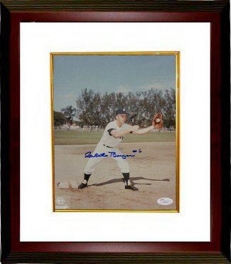 In his 16-year career, Clete Boyer hit 162 home runs with 654 runs batted in and a .242 batting average in 1725 games played. The 1961 team (with Mickey Mantle, Roger Maris, Yogi Berra and Moose Skowron), which defeated the Cincinnati Reds in the World Series, was considered by many as the best eve. Boyer batted only .224 during the regular season, but more than made up for it with his defense in an infield that also featured the double play duo of Tony Kubek at shortstop and Bobby Richardson at second base. In the first game of that World Series, Boyer displayed his defense by making two spectacular plays—one on a ground ball in the second inning, in which Boyer stopped the ball backhanded and threw Freese out from his knees, and another on a Dick Gernert ground ball in which Boyer dove to his left and threw Gernert out, also from his knees. Clete Boyer has hand signed this New York Yankees 8x10 Photo with #6 inscription. JSA Hologram and Certificate of Authenticity. Clete Boyer died on June 4, 2007 at age 70. Custom White Mat and Premium Mahogany Frame as shown.