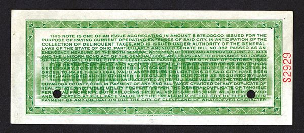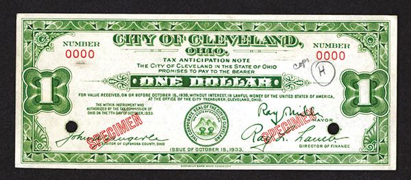 Ohio. 1 Dollar. Tax Anticipation Note. To be paid on or before October 15, 1938. Republic BNC. Red overprint Specimen, serial # as 0000. Pencil production notation on face. Small staple hole at top left corner. Very Fine, with some production handling.