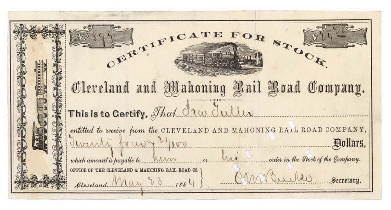 1864, Ohio. Stock certificate valued at $25.21. Black/White. Vignette at top center and left side of trains. Punch cancelled. Very fine.