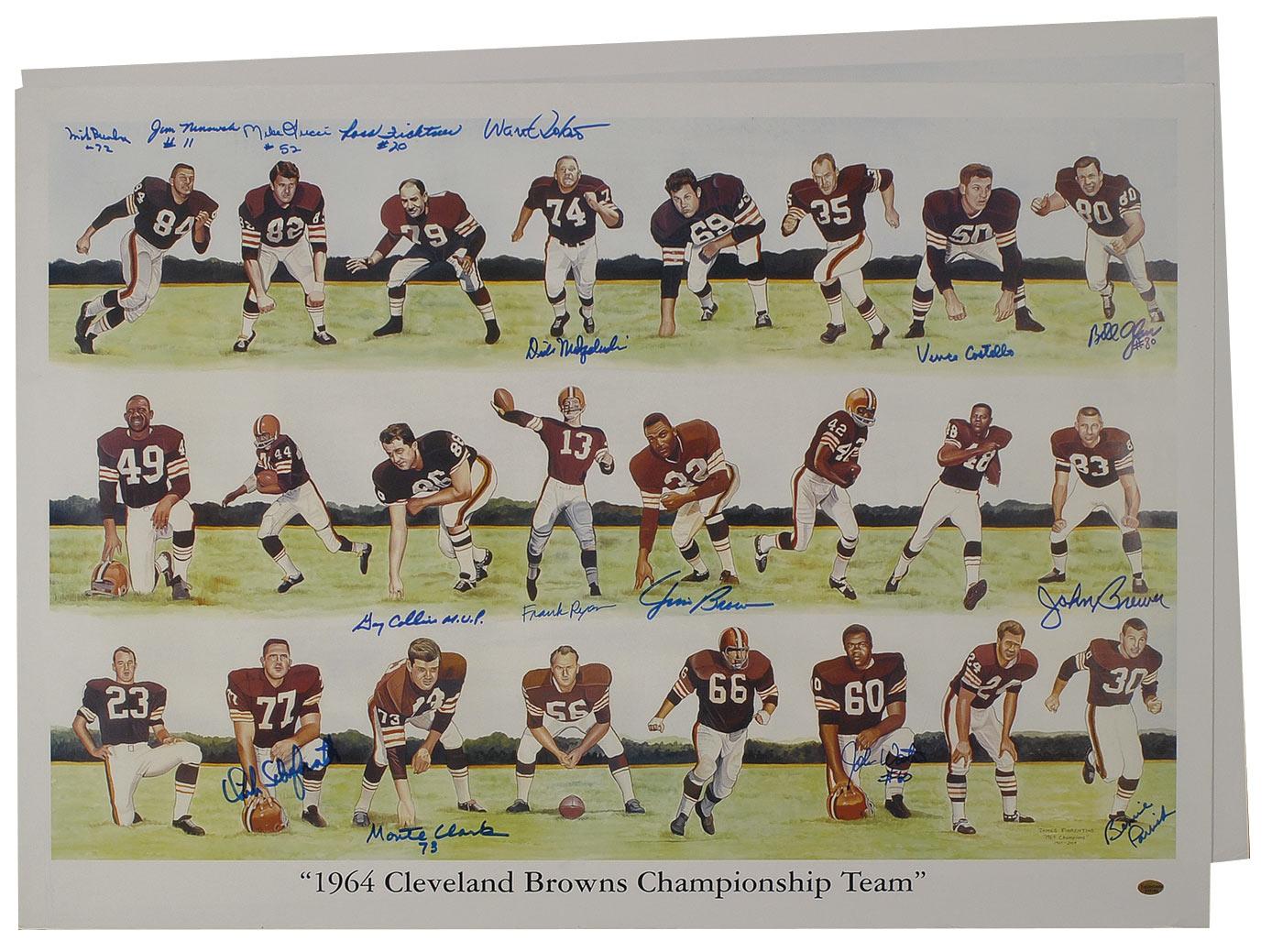 Two identical color 34 x 24 prints honoring the 1964 NFL Champion Browns, each signed in blue felt tip by 16 members of the team. Signers include: Jim Brown, Frank Ryan, Gary Collins, Dick Modzelewski, Bernie Parrish, Vince Costello, Monte Clark, Bill Glass, Mike Lucci, Mike Bundra, Jim Ninowski, John Brewer, John Wooten, Walter Roberts, Dick Schafrath, and Ross Fichtner. Rolled and in fine condition, with a few edge creases and dings.