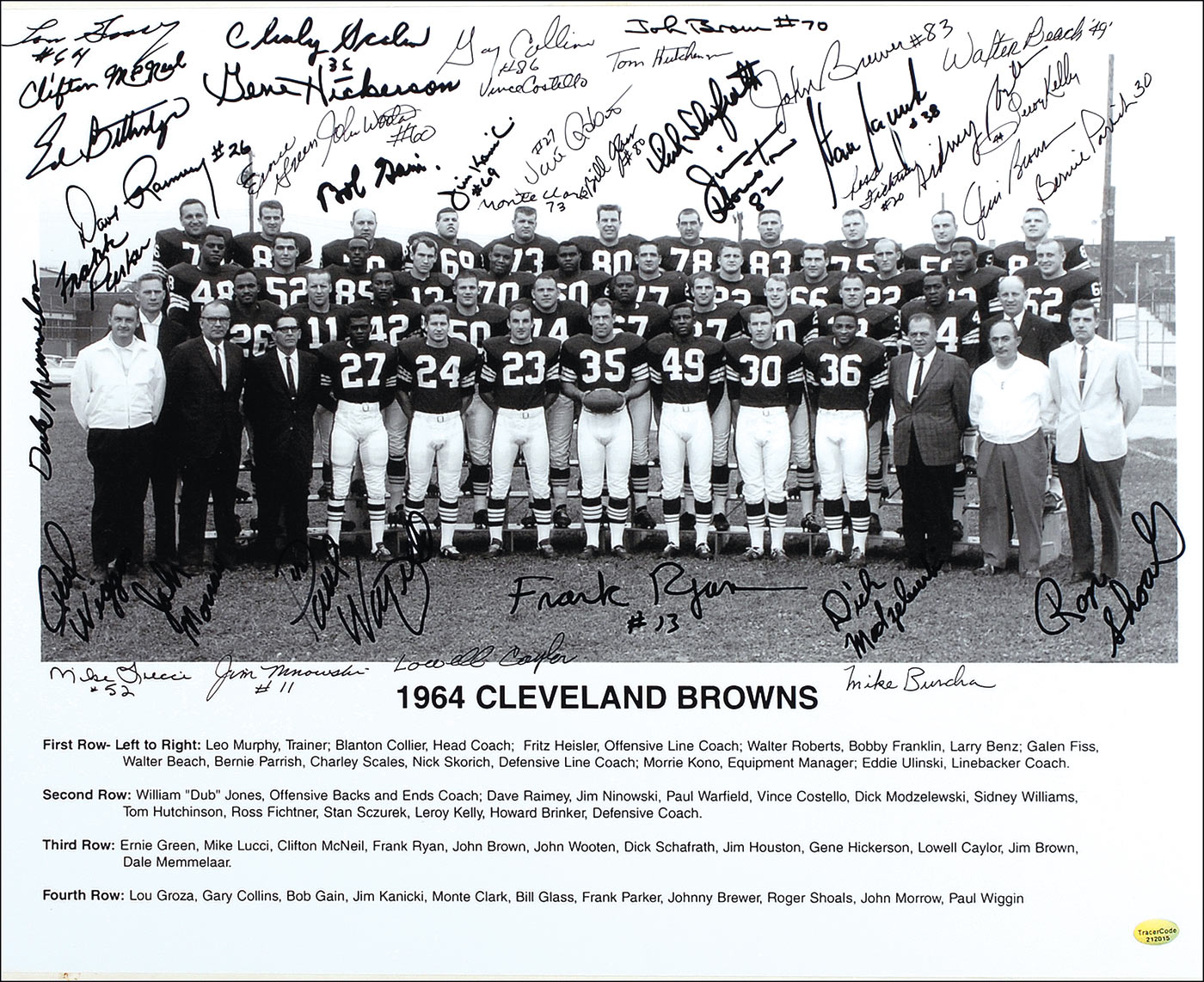 Satin-finish 20 x 16 photo of the 1964 Browns, signed in black felt tip by more than 30 members, including Jim Brown, Leroy Kelly, Paul Warfield, Gary Collins, Gene Hickerson, Lowell Caylor, Jim Ninowski, Mike Lucci, Paul Wiggin, Jim Kanicki, John Brown, John Brewer, Clifton McNeil, Dale Memmelaar, Charley Scales, Dick Modzelewski, Dave Raimey, Roger Shoals, John Wooten, Bernie Parrish, Stan Sczurek, Monte Clark, Frank Parker, Tom Hutchinson, Walter Beach, Vince Costello, Bob Gain, and Frank Ryan. In fine condition.