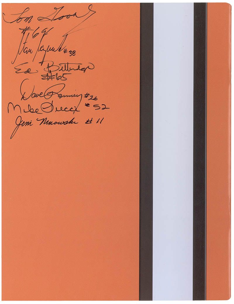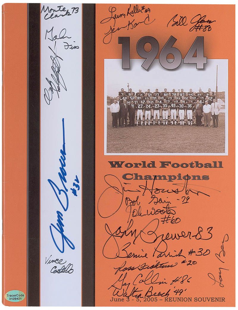 Souvenir program from the 1964 World Champion Cleveland Browns reunion from June of 2005, 8.5 x 11, signed on the front and back cover in blue and black felt tip by 23 members of the 1964 Browns. Signers include: Jim Brown, Leroy Kelly, Gary Collins, Frank Ryan, Bernie Parrish, Galen Fiss, John Brewer, John Wooten, and Jim Houston. In fine condition.