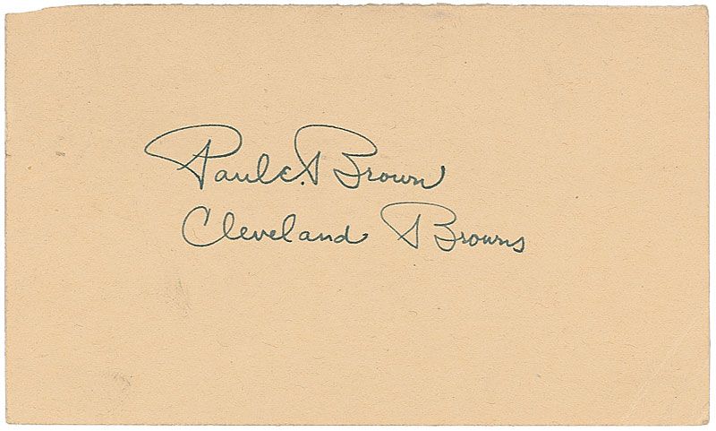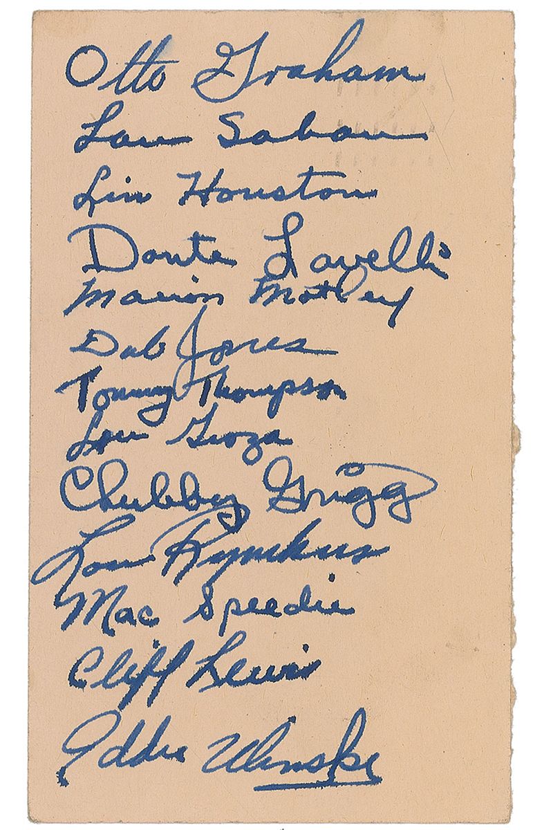 Vintage ink signature, “Paul E. Brown, Cleveland Browns,” on an off-white 5.5 x 3.25 government postcard postmarked November 14, 1949; and vintage ink signatures of 13 members of the 1949 Cleveland Browns on a 3.25 x 5.5 government postcard postmarked November 8, 1949. Signers include: Otto Graham, Lou Saban, Donte Lavelli, Marion Motley, Lou Groza, Chubby Grigg, Mac Speedie, Cliff Lewis, and Tommy Thompson. In fine condition, with some light feathering to a few of the players’ signatures.