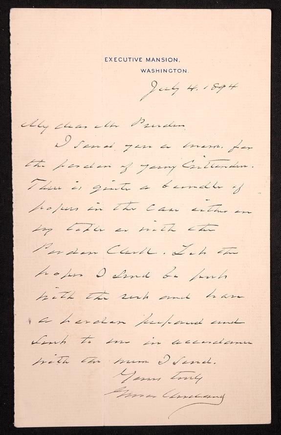 Cleveland, Grover (1837-1908) 22nd and 24 President of the United States (1885-1889, 1893-1897). Autograph letter signed as President on Executive Mansion letterhead, 1 page, 7¾ x 4¾", Washington, July 4, 1894. To Mr. Pruden, regarding a pardon: "I send you a memo for the pardon of …Crittenden. There is quite a bundle of papers in the case either on my table or with the pardon clerk. Let the papers I send be put with the rest and have a pardon prepared and sent to me in accordance with the memo I send." Minor soiling; one vertical fold, not affecting signature. Boldly penned and signed. Autograph letters signed by Cleveland as President are not common.