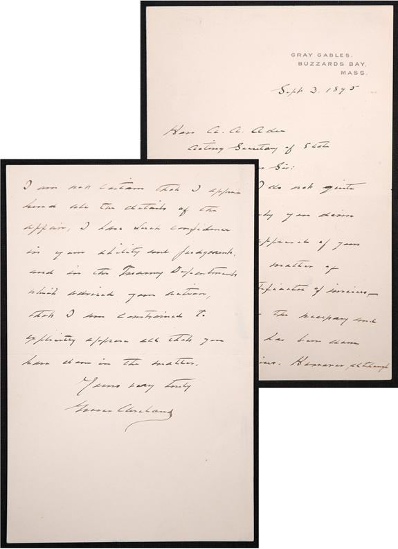 Cleveland, Grover. Autograph letter signed as President, 1 page, on engraved "Gray Gables. Buzzards Bay, Mass" stationery, 2pp (recto/verso), 6¾ x 4¼", 1895 To Hon. A[lvey] A. Adee (1842-1924),Acting Secretary of State, in part: "I do not quite understand why you desire my…approval… in the matter of comitas [?] certificates of finances…although I am not certain that I approve …all the details of the affair, I have such confidence in your ability and judgment, and in the Treasury Department, which advised your action, that I am constrained to explicitly approve all that you have done in the matter." Fine. Secretary of State Walter Q. Gresham died on May 28, 1895, and Richard Olney was appointed on June 8, 1895. Adee was Third Assistant Secretary at this time, but is addressed here as Acting Secretary of State. In 1886, he was promoted to Second Assistant Secretary, a post that was only ever held by Adee and one other person (William Hunter), and one that he held until his death.