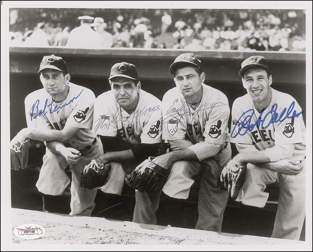 Glossy 10 x 8 photo of four members of the Indians posing on the dugout steps, signed in blue felt tip by Bob Lemon and Bob Feller and in blue ballpoint by Mike Garcia and Early Wynn. In fine condition, with a James Spence authentication label affixed to lower corner. Accompanied by a certificate of authenticity from James Spence.