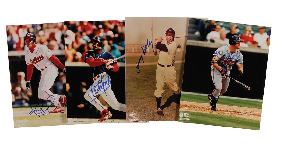 Four color glossy 8 x 10 photos of an individual Cleveland Indian’s player, each signed in blue felt tip. Signers are: Larry Doby, Jim Thome, Sandy Alomar, Jr., and Omar Vizquel. In fine condition, with scattered light surface marks.