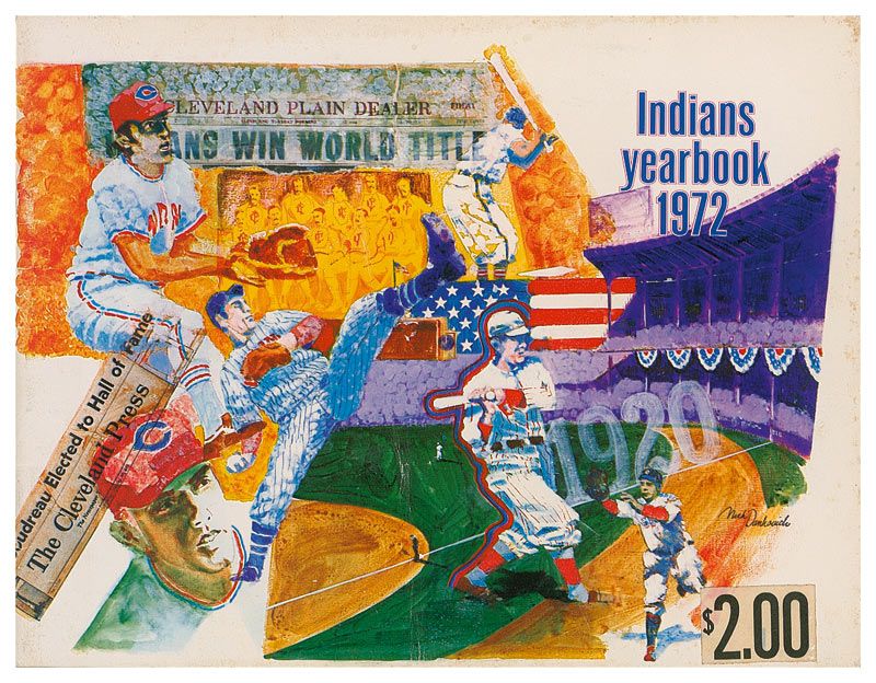 Softcover 1972 Cleveland Indians yearbook, 11 x 8.5, 48 pages, signed inside in blue ballpoint by 28 Indians, including Warren Spahn, Graig Nettles, Gaylord Perry, Buddy Bell, Del Unser, Tick Tidrow, Frank Duffy, and Ray Foster. In fine condition, with diagonal crease to back cover, light central vertical crease and price label to front cover, and expected handling wear.