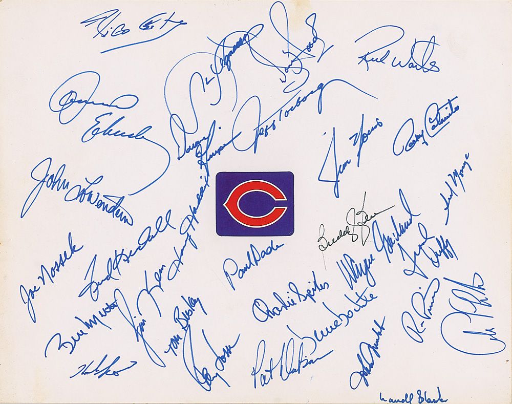 Twenty-nine felt tip signatures from a 1970s Cleveland Indians team on an off-white 14 x 11 cardstock sheet with a Cleveland logo affixed to the center. Signers include: Rocky Colavito, Harvey Haddix, Dennis Eckersley, Jim Kern, Ray Fosse, and Frank Duffy. In fine condition, with light toning and soiling to the borders.