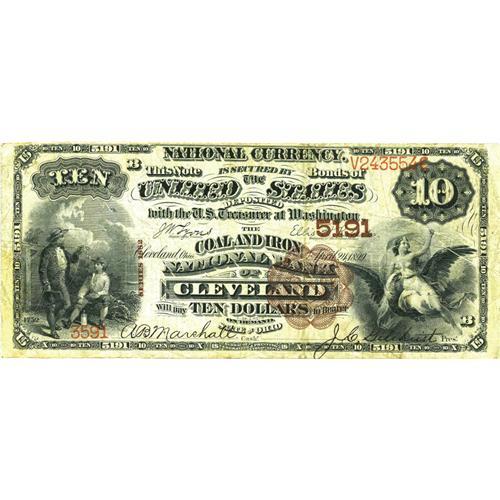 <B>Cleveland, OH</B></I> - $10 1882 Brown Back Fr. 490 <B>The Coal & Iron NB</B></I> Ch. # 5191<BR>This example has been off the market since its last appearance in a 1985 Hickman and Oakes sale. It is one of only six pieces extant from this Brown Back only bank, which was in operation for only four years between 1899 and 1903. Pen signed <B>Fine-Very Fine.</B></I>