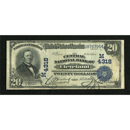 <B>Cleveland, OH</B></I> - $20 1902 Date Back Fr. 645 <B>The Central NB</B></I> Ch. # (M)4318<BR> A couple of pinholes are noted on this otherwise solid note. The signatures are bold and add to the overall eye appeal. <B>Fine.</B></I><BR><I>From The John Ameen Collection</B></I><BR><BR><b>Shipping:</b> Coins & Currency (<a target="_blank" href="http://www.heritageauctions.com/common/shipping.php">view shipping information</a>)