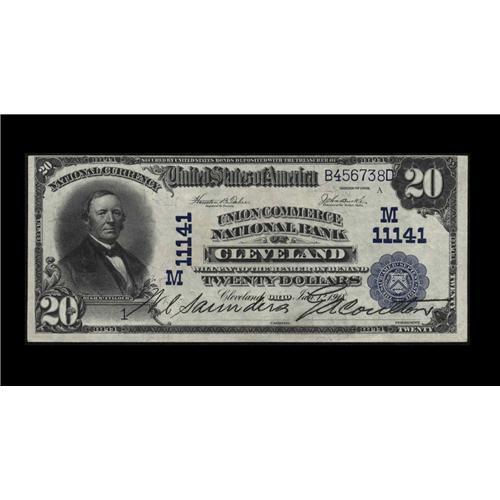 <B>Cleveland, OH</B></I> - $20 1902 Plain Back Fr. 658 <B>Union Commerce NB</B></I> Ch. # (M)11141<BR>An attractive example bearing serial number 1. Bright <B>Crisp Uncirculated,</B></I> with a couple of pinholes and the top a bit close.