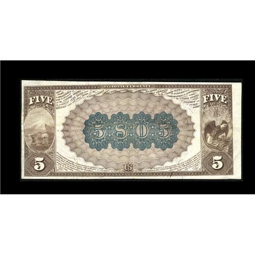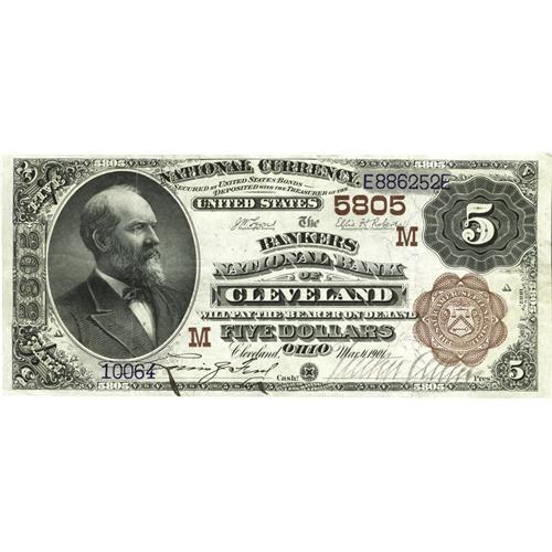 <B>Cleveland, OH</B></I> - $5 1882 Brown Back Fr. 477 <B>The Bankers NB </B></I> Ch. # (M)5805<BR>It is unfortunate that the ink used during this period was so acidic and this note bears witness to it as it suffers some paper erosion in the signature. One of very few notes available as this institution was afloat for about three years. <B>Very Fine.</B></I>