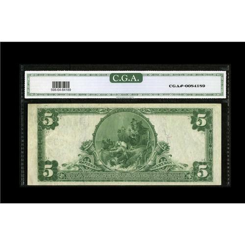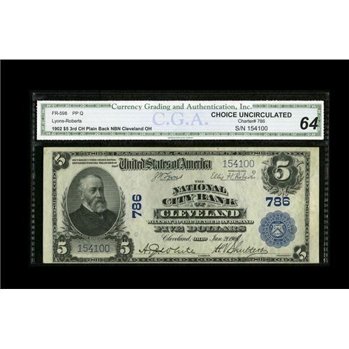 <B>Cleveland, OH</B></I> - $5 1902 Plain Back Fr. 598 <B>The National City Bank</B></I> Ch. # 786<BR>Nice original paper waves are noted in the holder as is a touch of handling which accounts for the grade. <B>CGA Choice Uncirculated 64.</B></I>
