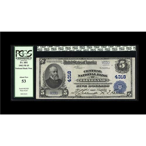 <B>Cleveland, OH</B></I> - $5 1902 Plain Back Fr. 601 <B>The Central NB</B></I> Ch. # 4318<BR>This note is blessed with printed black signatures. <B>PCGS About New 50.</B></I><BR><BR><b>Shipping:</b> Coin/Currency (<a target="_blank" href="http://www.heritageauctions.com/common/shipping.php">view shipping information</a>)