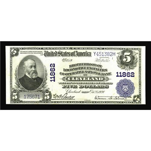 <B>Cleveland, OH</B></I> - $5 1902 Plain Back Fr. 607 <B>Brotherhood of Locomotive Engineers Co-Operative NB</B></I> Ch. # 11862<BR>This is one of the longest bank titles you will find in nationaldom and is always sought after in all grades. Few are as nice as this piece, which sports charter number embossing and delicately printed signatures. <B>Choice Crisp Uncirculated.</B></I>