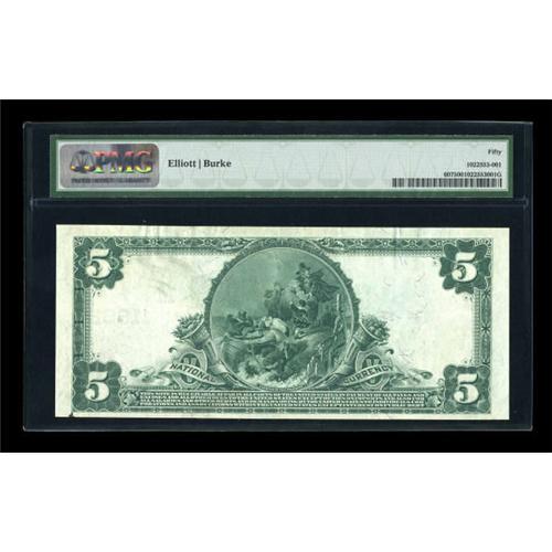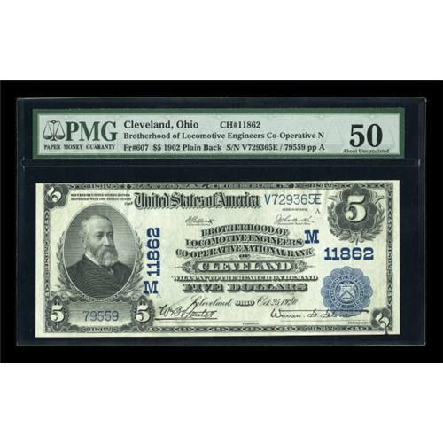 <B>Cleveland, OH</B></I> - $5 1902 Plain Back Fr. 607 <B>Brotherhood of Locomotive Engineers Co-Operative NB</B></I> Ch. # (M)11862<BR> A fresh and high grade example which bears an always sought after title. Bright <B>PMG About Uncirculated 50</B></I>.<BR><BR><b>Shipping:</b> Coins & Currency (<a target="_blank" href="http://www.heritageauctions.com/common/shipping.php">view shipping information</a>)
