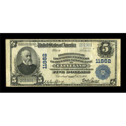 <B>Cleveland, OH</B></I> - $5 1902 Plain Back Fr. 607 <B>Brotherhood of Locomotive Engineers Co-Operative NB</B></I> Ch. # 11862<BR> This popularly titled issue shows engraved signatures. <B>Fine-Very Fine</B></I>, with some crispness remaining.<BR><BR><b>Shipping:</b> Coins & Currency (<a target="_blank" href="http://www.heritageauctions.com/common/shipping.php">view shipping information</a>)