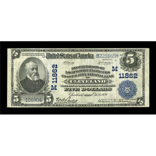 <B>Cleveland, OH</B></I> - $5 1902 Plain Back Fr. 607 <B>Brotherhood of Locomotive Engineers Co-Operative NB</B></I> Ch. # (M)11862<BR> A bright and evenly circulated example of this always in demand note, reputed to bear the longest title used on any National Bank Note. <B>Very Fine.</B></I><BR><BR><b>Shipping:</b> Coins & Currency (<a target="_blank" href="http://www.heritageauctions.com/common/shipping.php">view shipping information</a>)