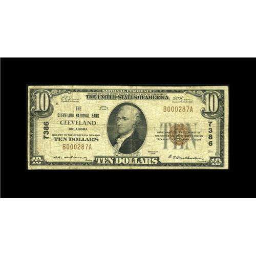 <B>Cleveland, OK</B></I> - $10 1929 Ty. 1 <B>The Cleveland NB</B></I> Ch. # 7386<BR>Simply a problem-free <B>Very Good-Fine</B></I> example.