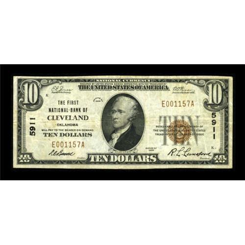 <B>Cleveland, OK</B></I> - $10 1929 Ty. 1 <B>The First NB</B></I> Ch. # 5911<BR> A nice<B> Very Fine </B></I>example from the senior of Cleveland's two issuing banks. <BR><BR><b>Shipping:</b> Coins & Currency (<a target="_blank" href="http://www.heritageauctions.com/common/shipping.php">view shipping information</a>)