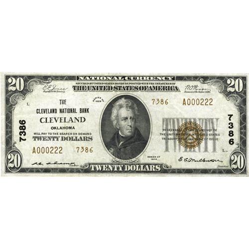 <B>Cleveland, OK</B></I> - $20 1929 Ty. 2 <B>The Cleveland NB</B></I> Ch. # 7386<BR>While certainly not rare, notes from here are almost all uniformally low grade. This piece is a happy exception, and may well be the highest grade Series 1929 example extant from here. <B>Extremely Fine.</B></I>