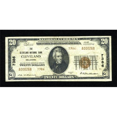 <B>Cleveland, OK</B></I> - $20 1929 Ty. 2 <B>The Cleveland NB</B></I> Ch. # 7386<BR> An attractive <B>Very Fine </B></I>with wholly original paper and boldly printed devices.<BR><I>From The Rolling Plains Collection</B></I><BR><BR><b>Shipping:</b> Coins & Currency (<a target="_blank" href="http://www.heritageauctions.com/common/shipping.php">view shipping information</a>)