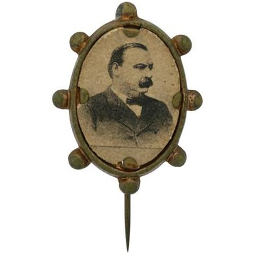 <B>Cleveland Oval Cardboard Stickpin.</B></I> This cardboard portrait of Cleveland is set into a bronze oval with a beaded frame. The photo is in fine condition with no noticeable blemishes or damage. The brass has a nice patina. Grover Cleveland ran for president despite being branded a draft dodger by his opponent Blaine, he got away with it because it was soon discovered that Blaine had done the same thing himself! Measures 20mm x 30mm. <BR><BR><b>Shipping:</b> Miscellaneous Collectibles, Smal (<a target="_blank" href="http://www.heritageauctions.com/common/shipping.php">view shipping information</a>)